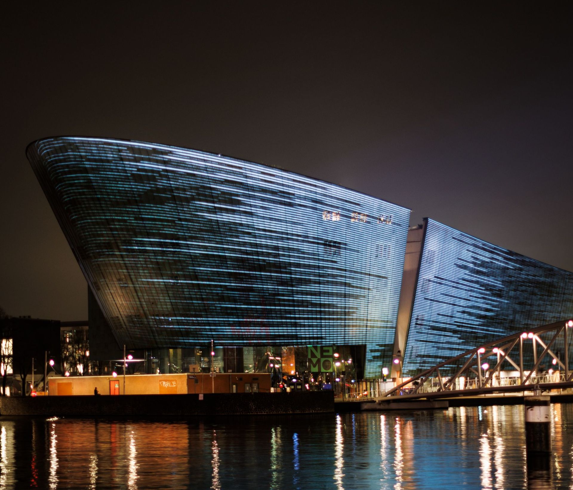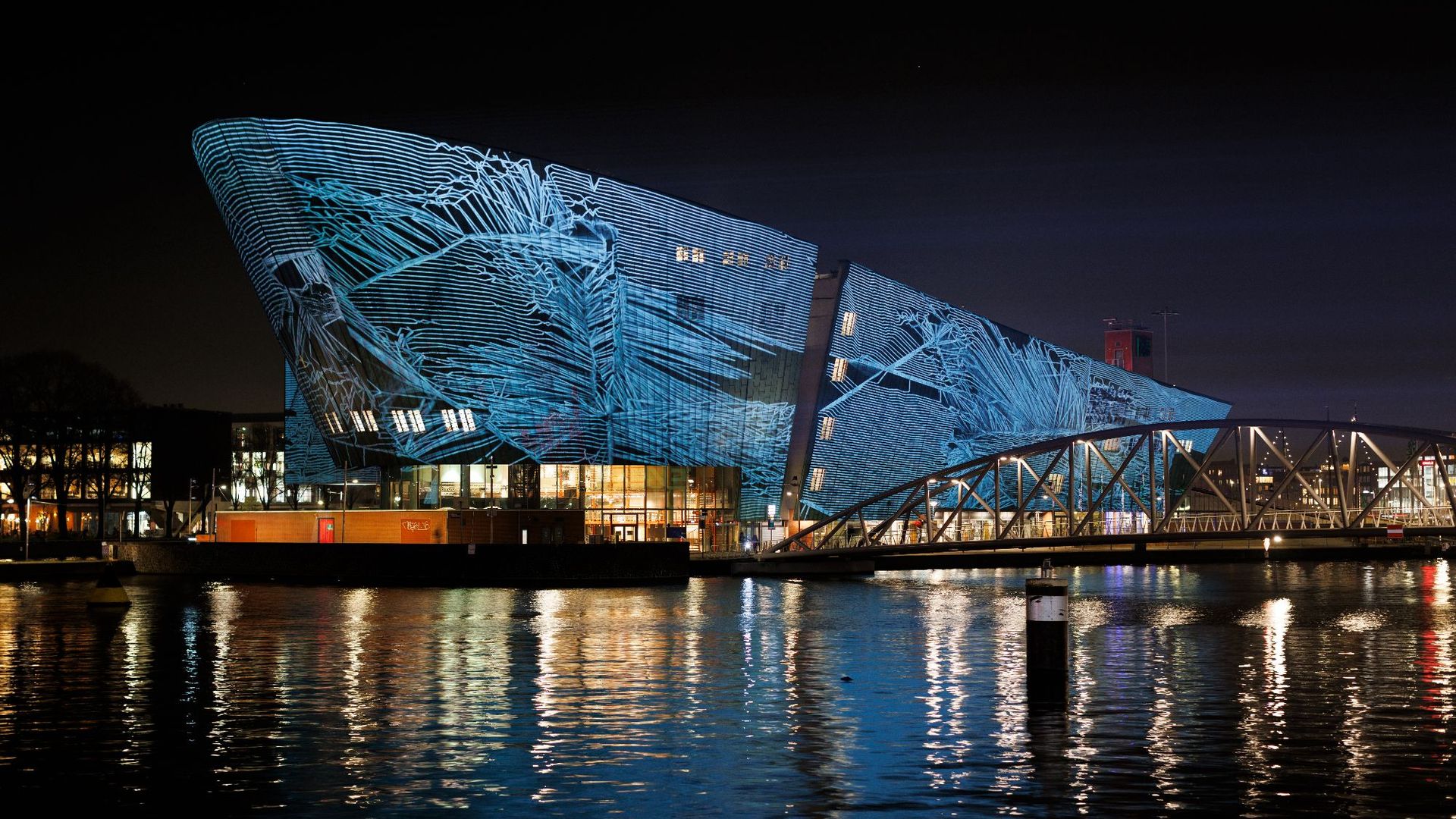 Op de gevel van NEMO wordt het kunstwerk Fracture Point van Filip Roca geprojecteerd.