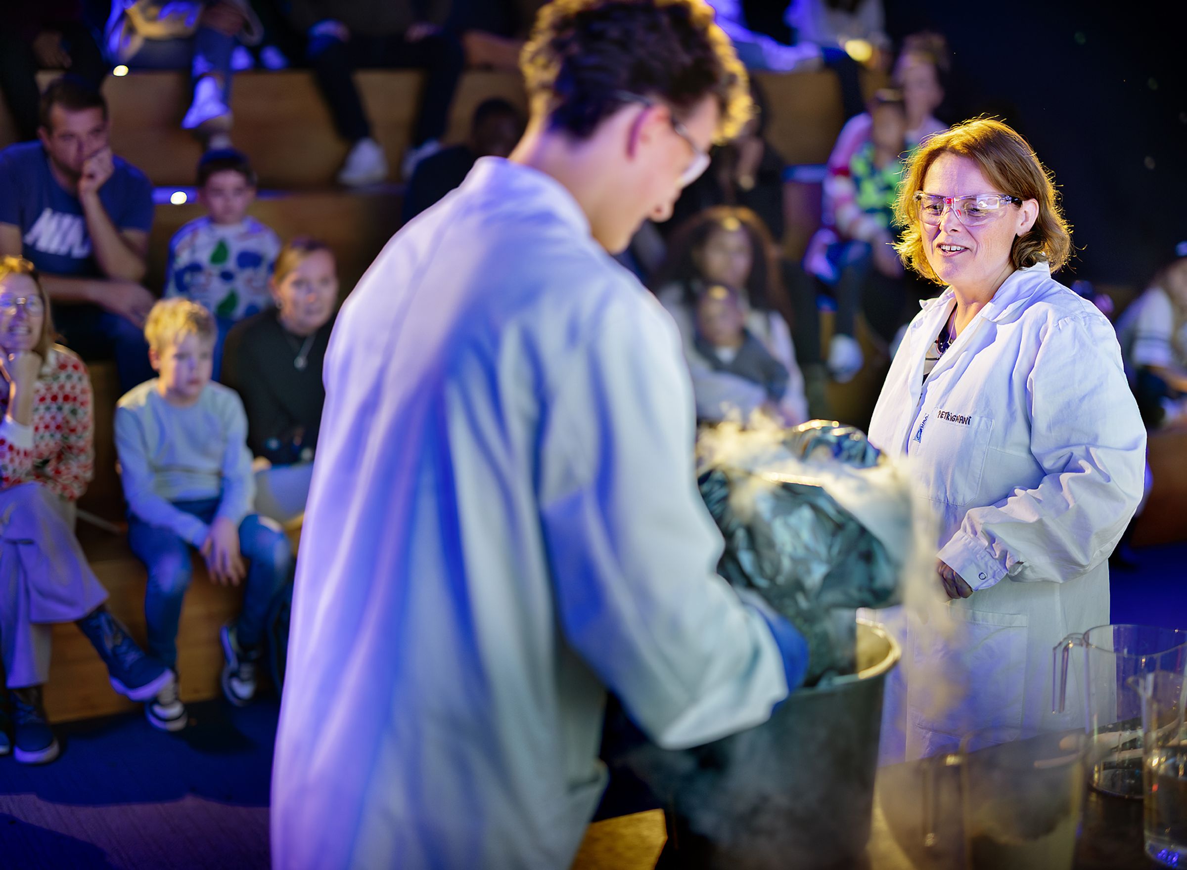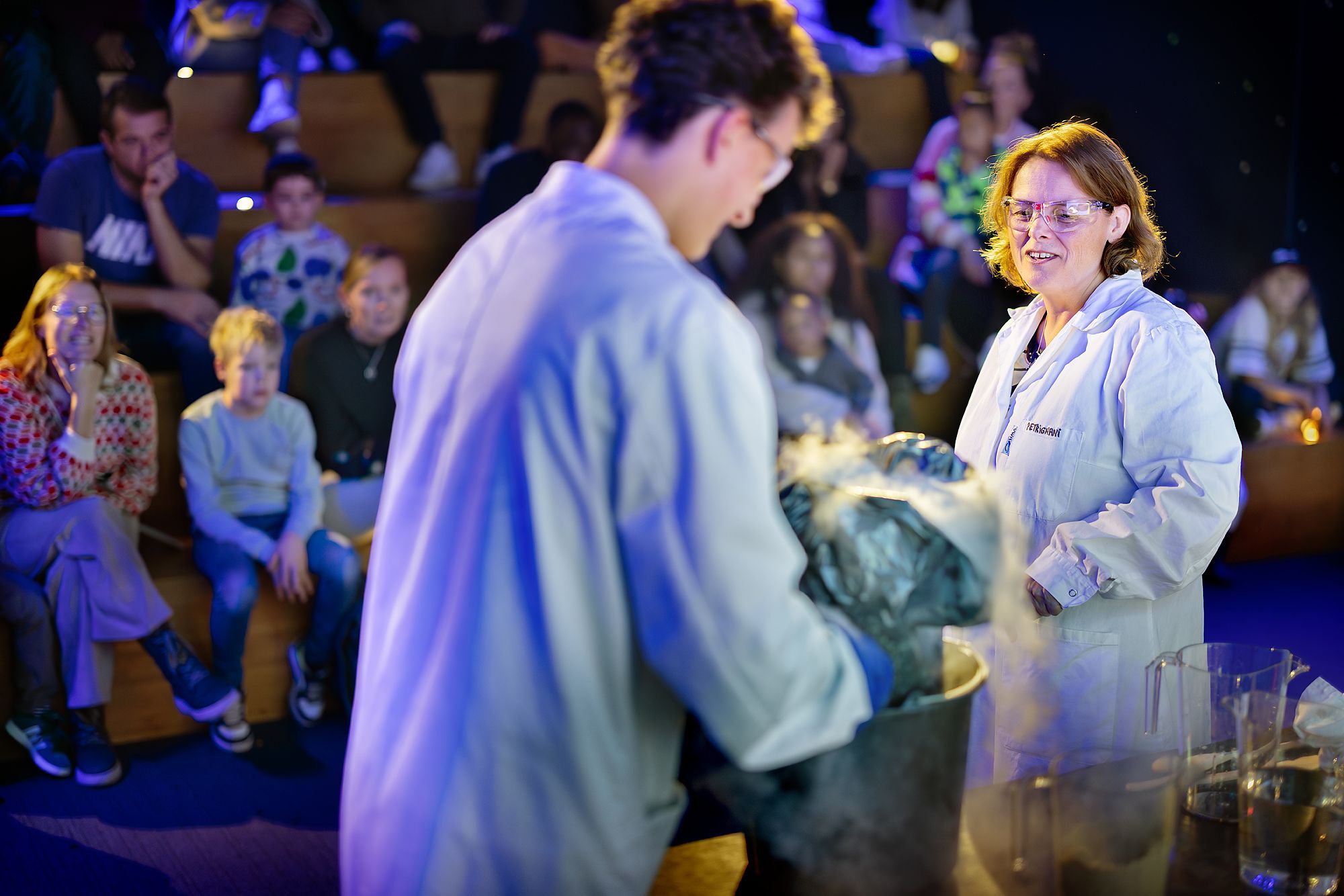 Een wetenschapper pluist één van de ingestuurde vragen uit met experimenten en boeiende uitleg.
