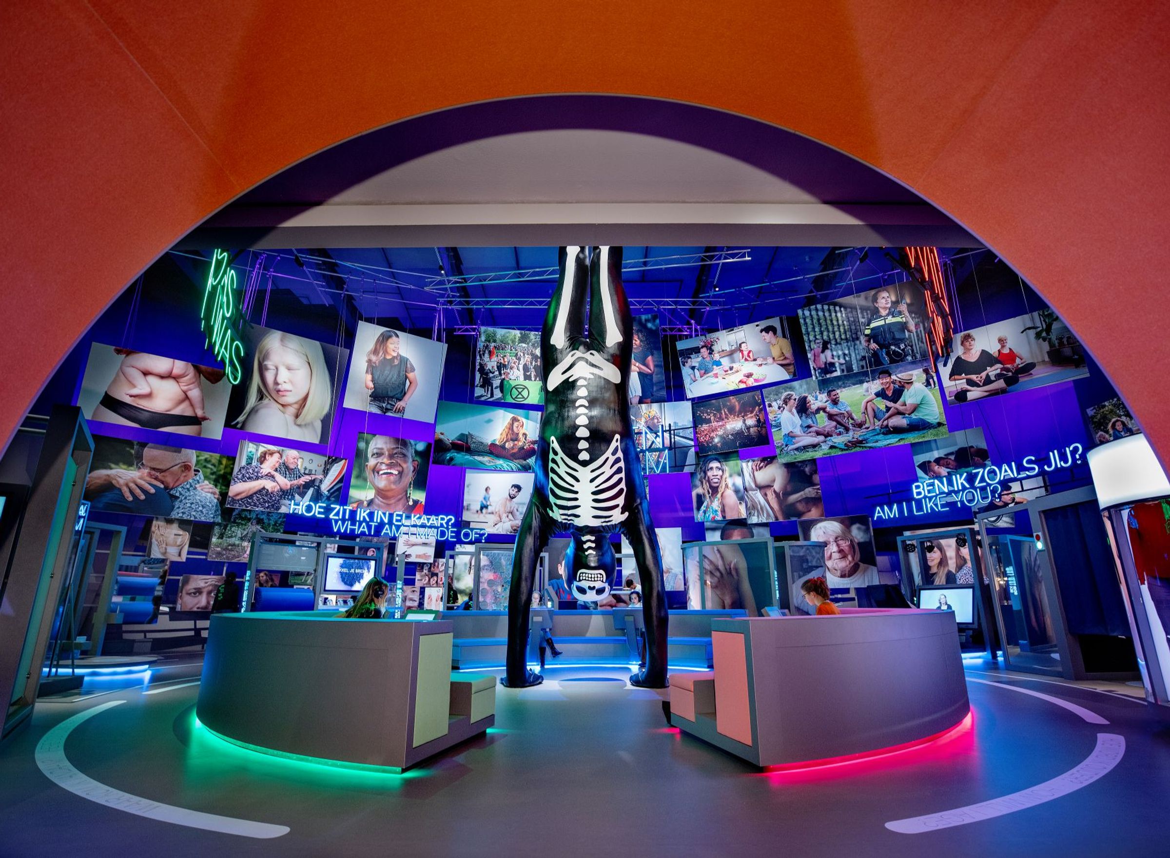 Midden in Humania staat het 8,5 meter hoge kunstwerk 'Een handstand' van Florentijn Hofman. Je ziet een mens ondersteboven en binnenstebuiten — de mens zit binnenin, het skelet aan de buitenkant — en in een enorm formaat. Zo laat de kunstenaar je net even anders kijken naar de wereld om je heen.