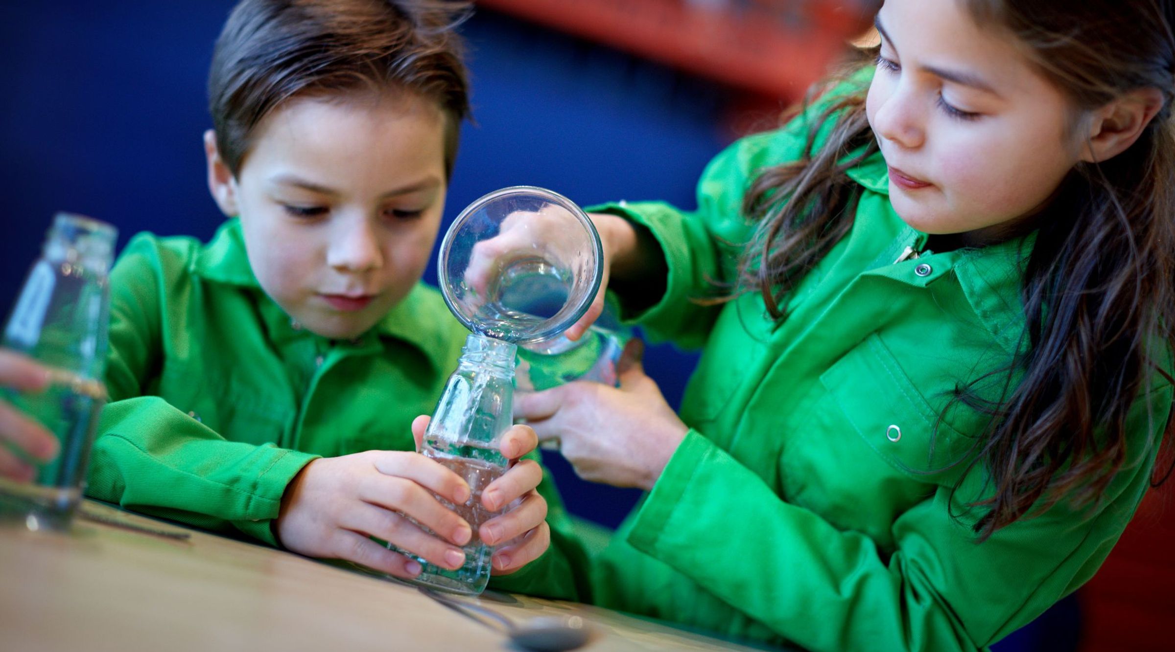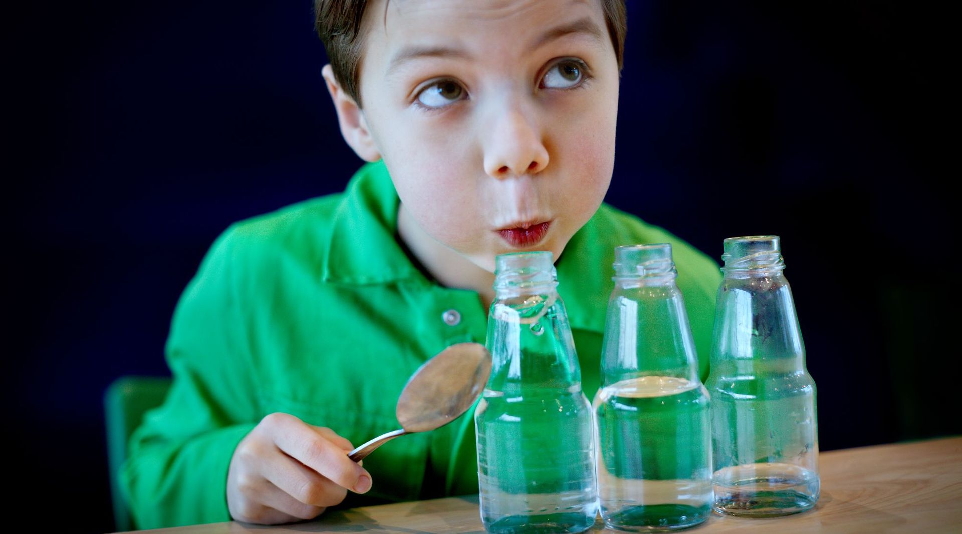 Als je over de opening van een fles blaast, gaan de luchtdeeltjes binnenin trillen. Die trillingen worden geluidsgolven. Hoeveel water er in de fles zit, bepaalt hoe hoog of laag het geluid is.Hoe meer water, hoe minder ruimte er is voor de lucht om te trillen. De luchtmoleculen trillen dan sneller, en je hoort een hogere toon.
