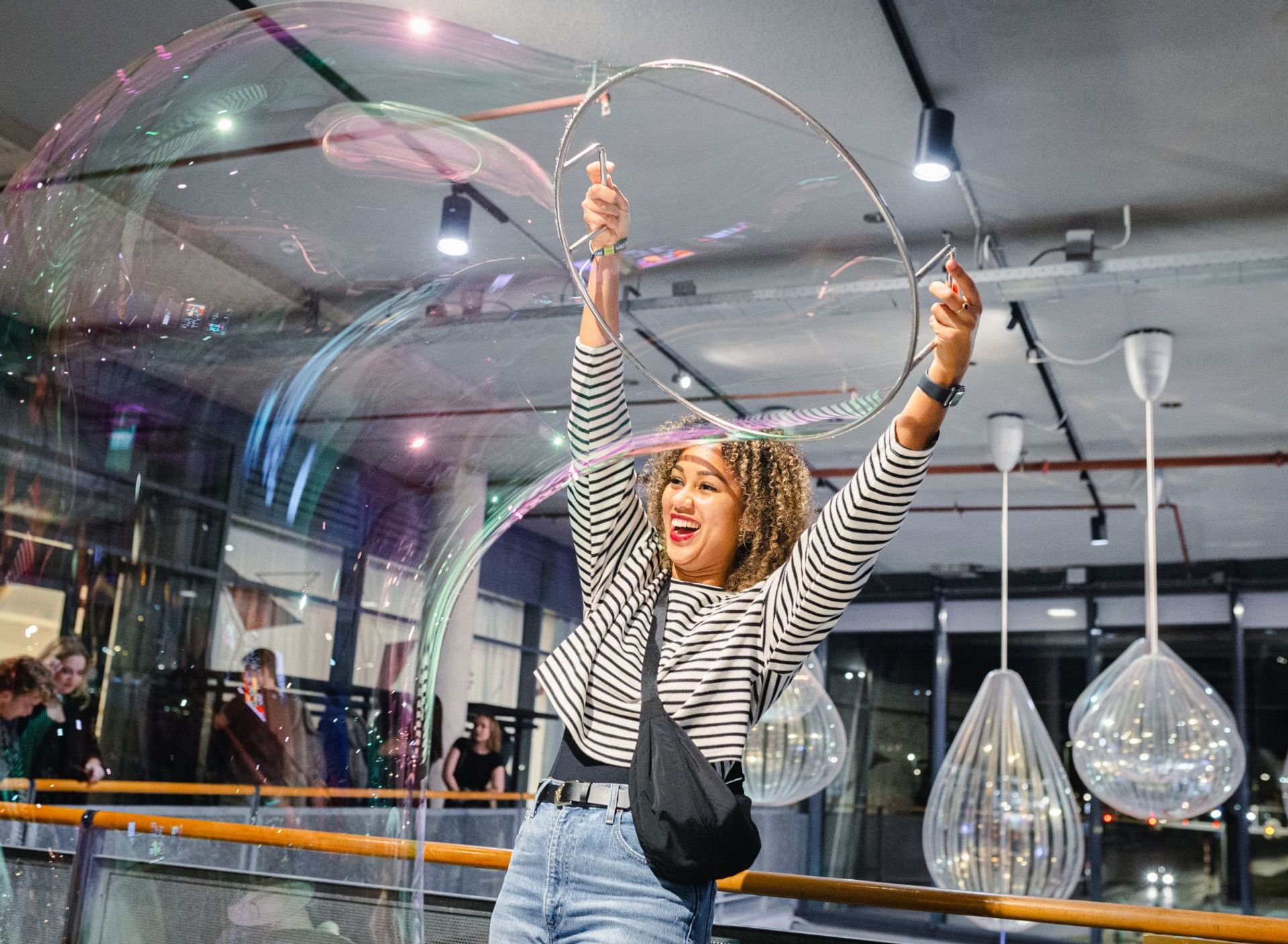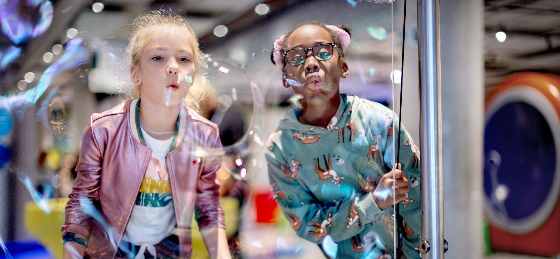 Een zeepbel is een dun laagje water gevangen tussen zeep en glycerine. De bel weerkaatst wit licht, dat alle kleuren van de regenboog bevat — precies wat je terugziet in de zeepbel. Met NEMO's superzeepsop maak je gigantische bellen, groot genoeg om zelf in te staan!