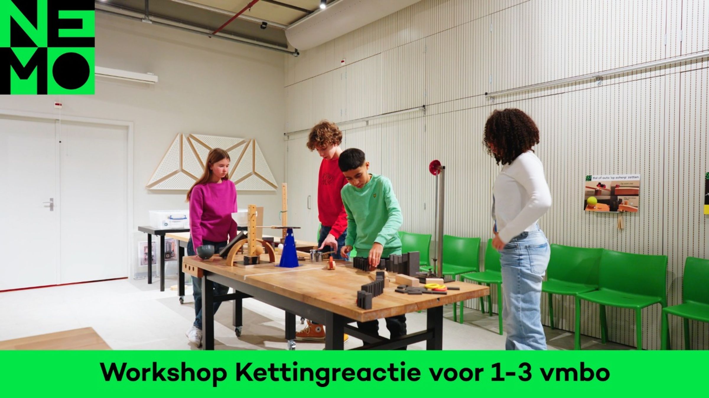 Leerlingen bouwen in twee- en drietallen hun eigen onderdeel van één lange kettingreactie. Na afloop weten ze het belangrijkste principe van kettingreacties: actie is reactie. Bij deze workshop is een inleidende les voor in de klas beschikbaar.
