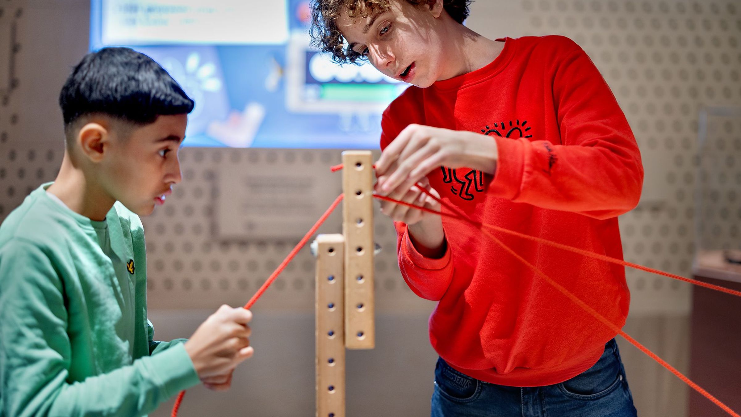Ze verzamelen het materiaal van de materiaaltafels en bouwen aan tafel aan de oplossing. Ze kunnen hierbij onder andere touwtjes knopen, klemmen gebruiken, tie-wraps dichtmaken en blokken stapelen.