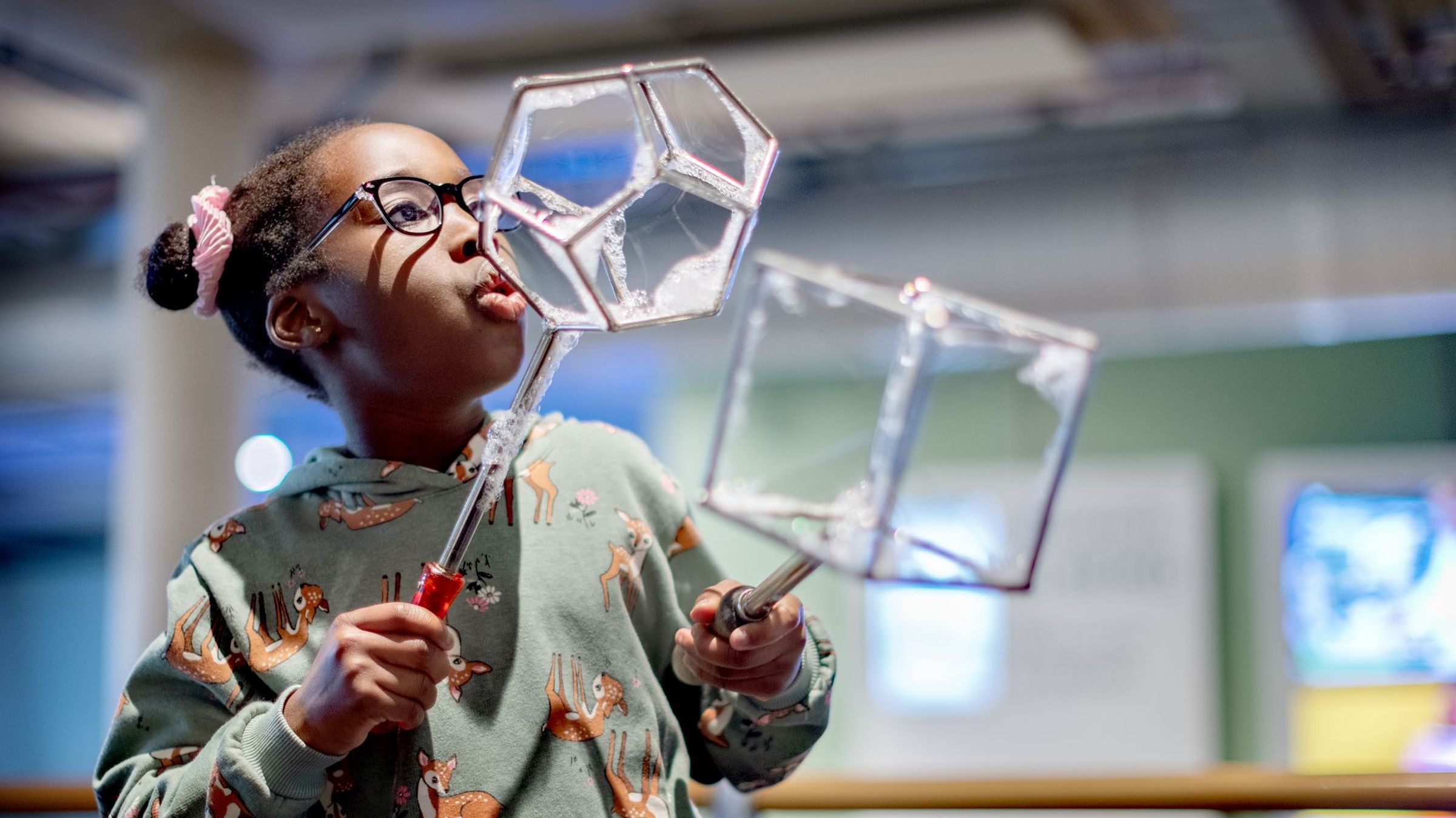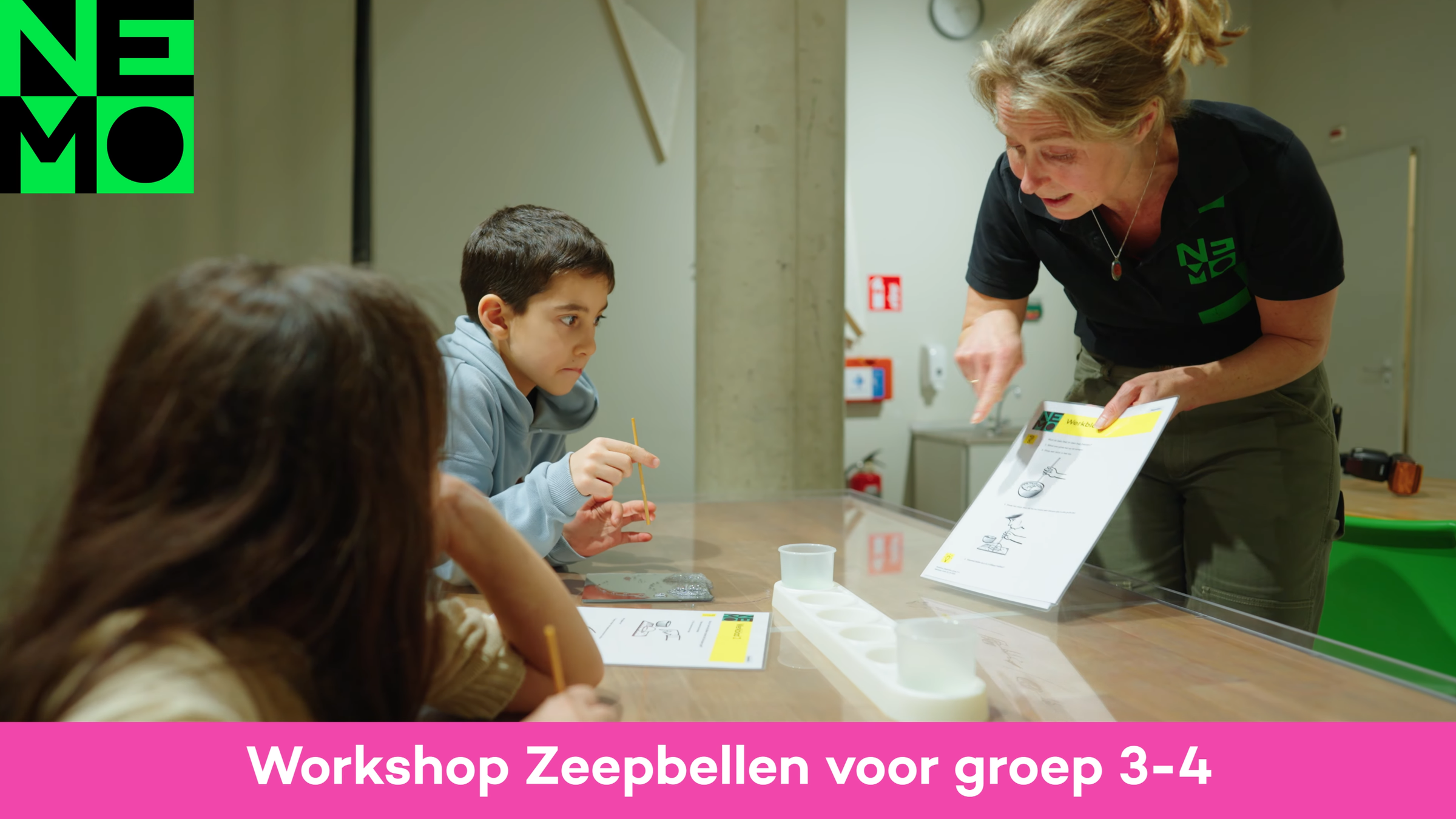 In de workshop Zeepbellen doen leerlingen onder begeleiding van een NEMO medewerker zelf kleine onderzoeken met zeepsop. Zo ontdekken ze of een zeepbel altijd rond is en of je een bel in een bel kunt maken.