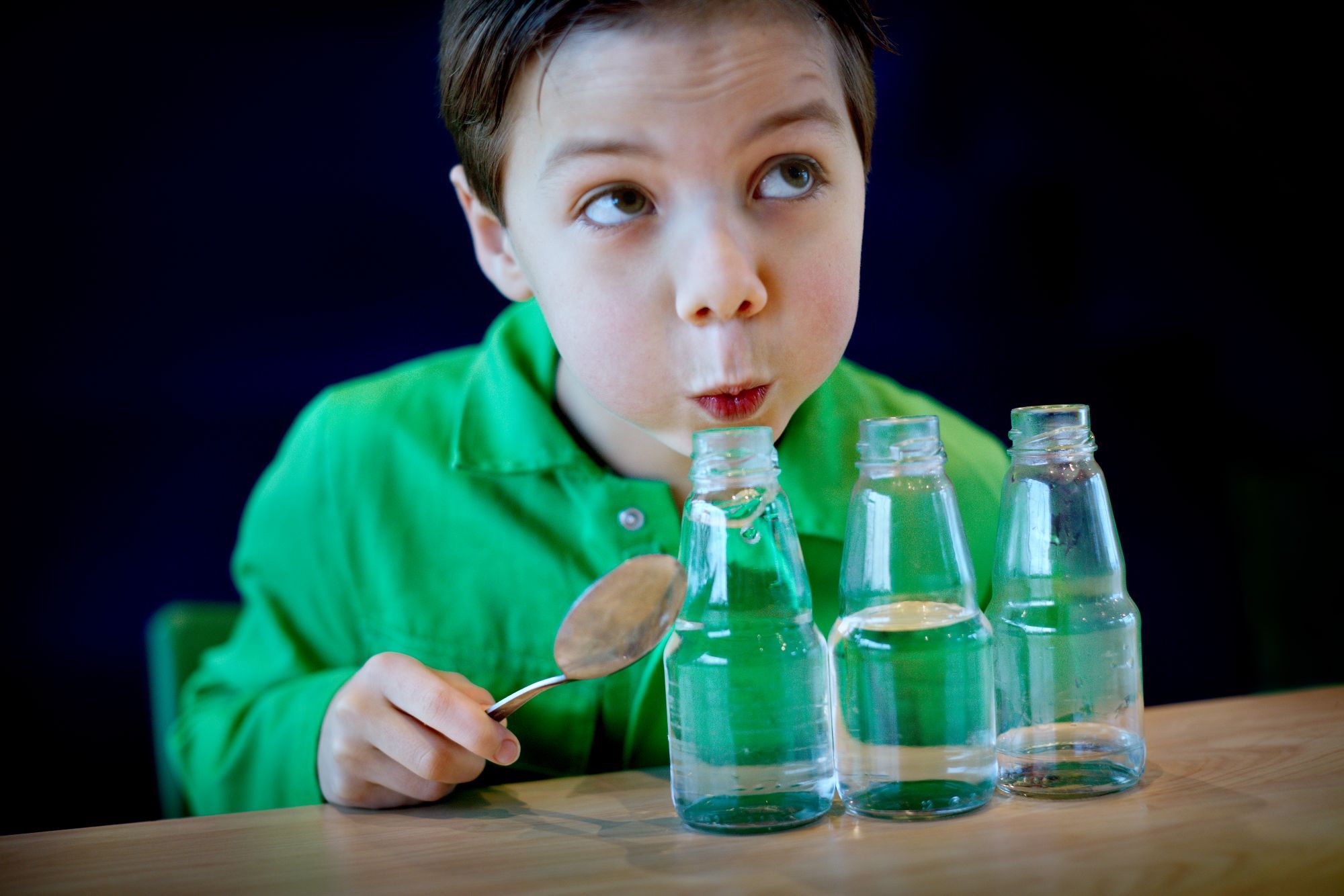 Je kunt ook muziek maken door in de hals van de flesjes te blazen. Wie verras jij met een mooi concert?