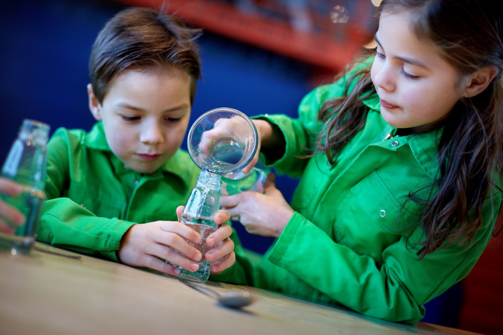 Giet in de drie flesjes verschillende hoeveelheden water. Vul het eerste flesje bijvoorbeeld tot een kwart. De tweede voor de helft. En flesje drie voor driekwart.