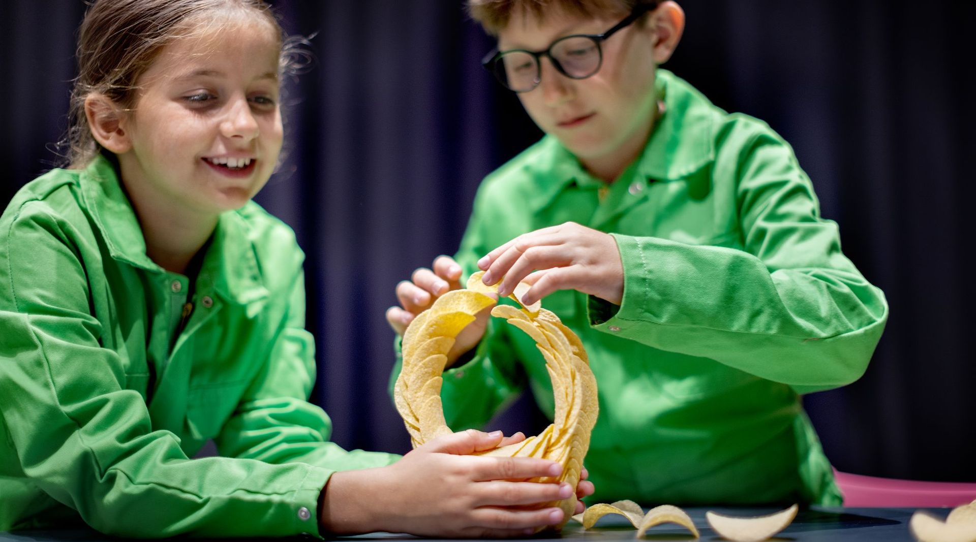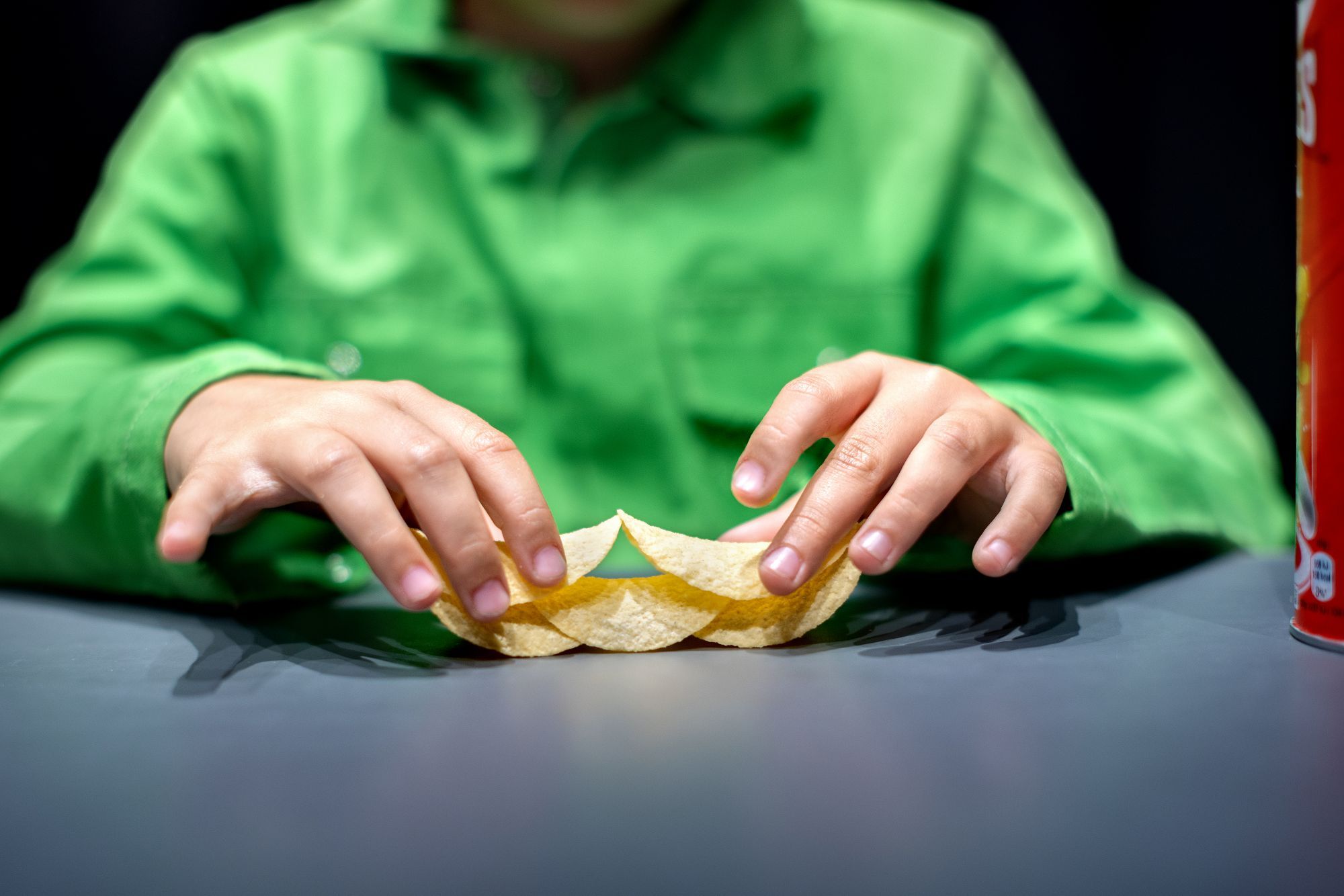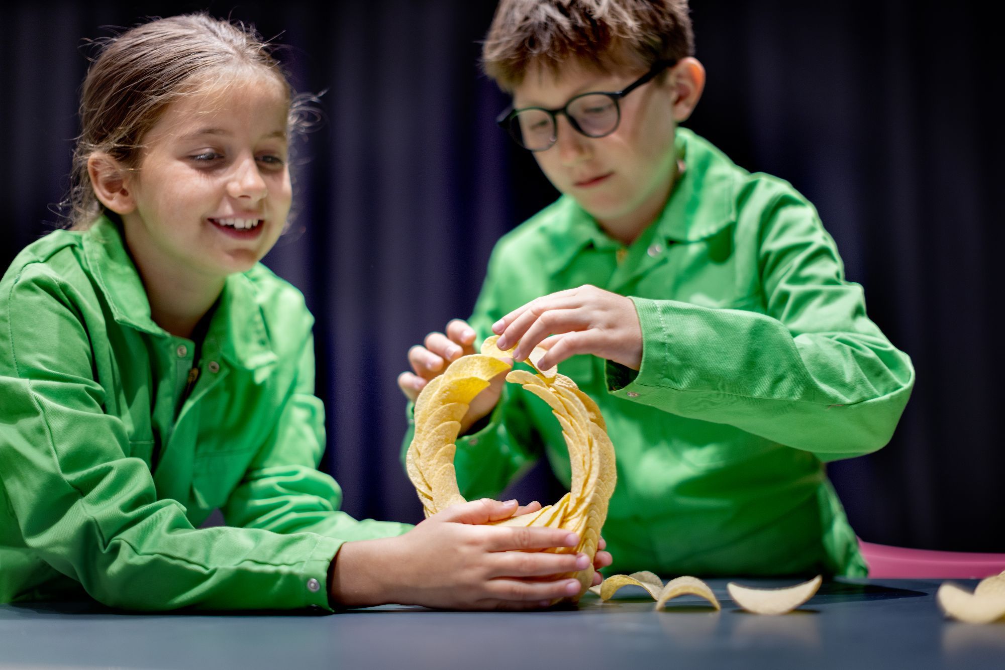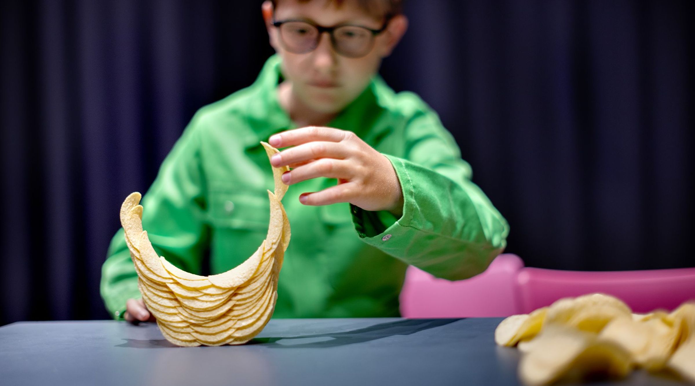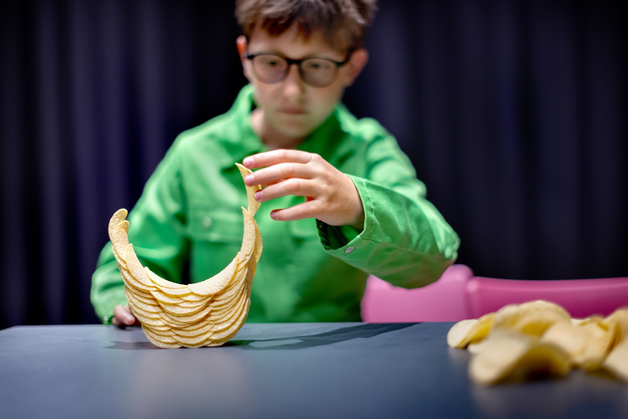 Je kunt voorwerpen scheef op elkaar stapelen zonder dat ze omvallen. Dat komt door het zwaartepunt van het voorwerp, in het midden. Het is vergelijkbaar met een boek, als je deze op de rand van de tafel legt blijft het boek liggen. Schuif je het boek verder, dan valt het op de grond als minder dan de helft van het boek niet meer op tafel ligt. En omdat de chipjes deze ronde vorm hebben, is het resultaat van het stapelen een chipcirkel!