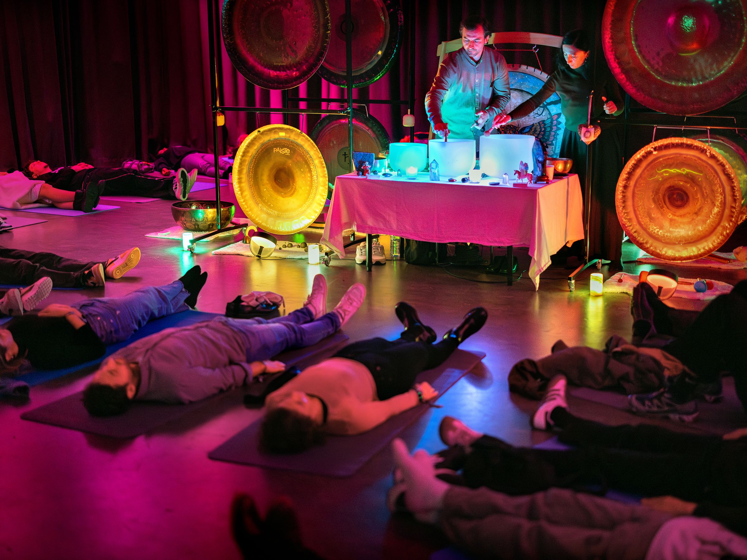 Het soundbath wordt verzorgd door Iulian en Nicoleta van Cosmic Sound. Tijdens Museumnacht 2023 gaven zij drukbezochte soundbaths in NEMO Science Museum, om het publiek als herboren de nacht weer in te laten stappen.