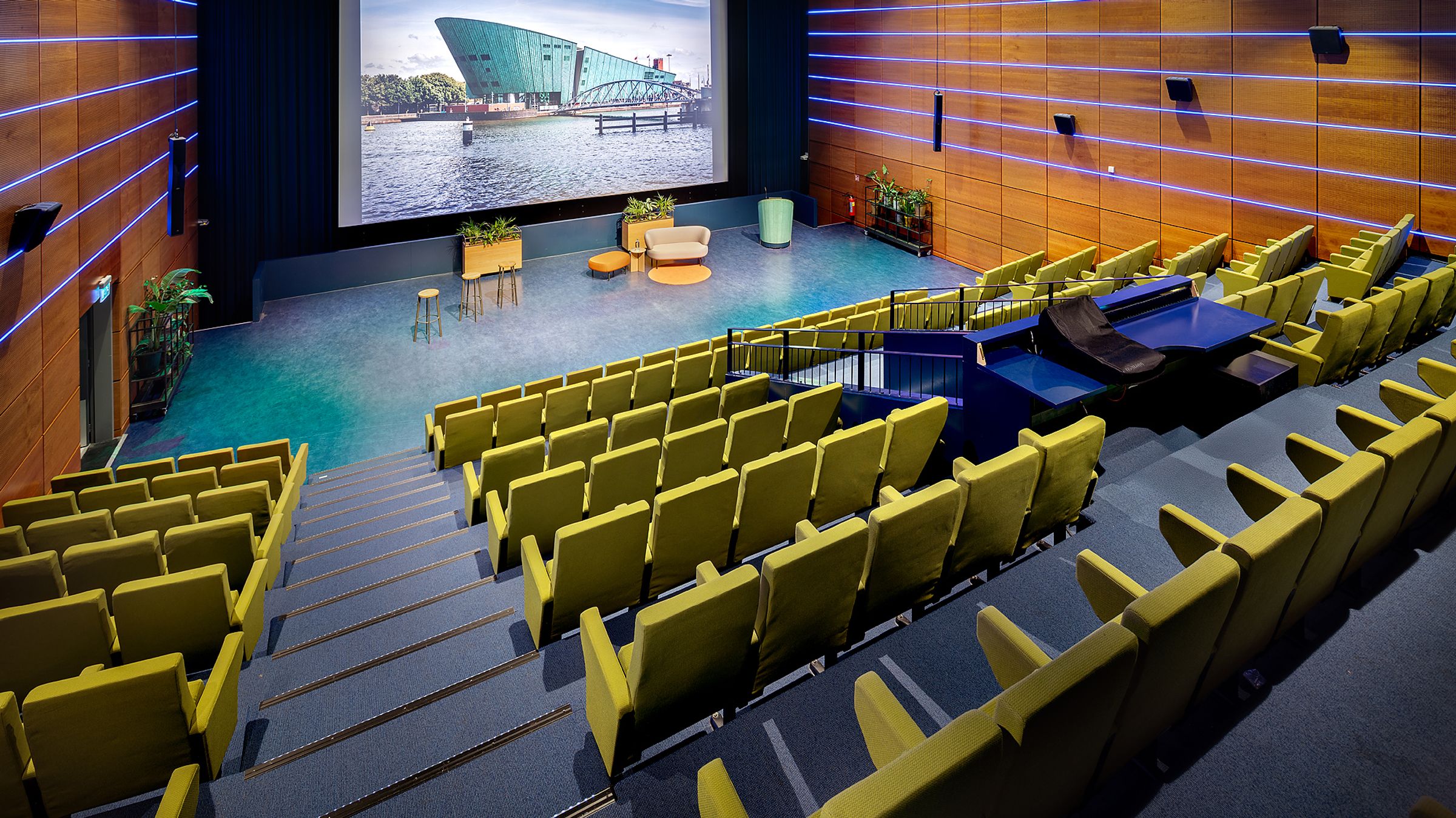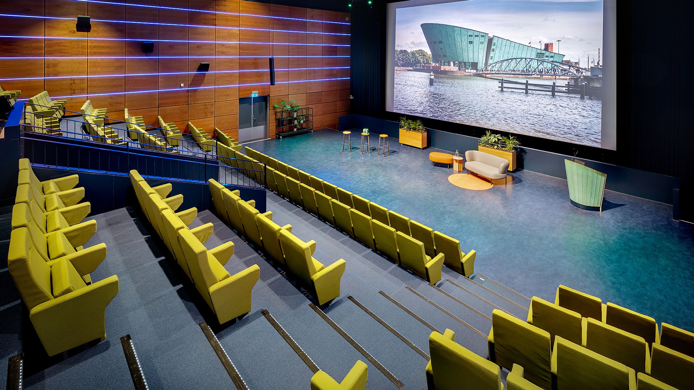 Midden in NEMO is een groot auditorium. De zitplaatsen bevinden zich op een hellend vlak, zodat gasten goed zicht hebben op het grote projectiescherm. Het is de perfecte zaal voor lezingen, congressen, debatten en filmvertoningen, middenin het kloppend hart van technologie en wetenschap.